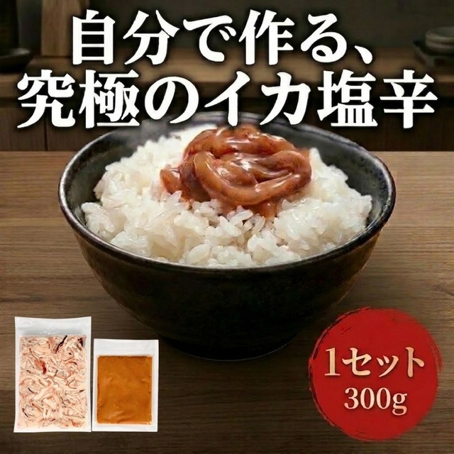 和えたてから熟成まで、味の変化を楽しめる。自分で仕上げる手作りいか塩辛セット。 刺身用のいかを皮付きのままカットして正肉と耳をブレンドしたものと、鮮度のよいいかの肝をベースに不要な添加物を使用せず塩・醤油などを加えて仕上げた肝の素を添付してセットにしました。 イカの切り身250gとイカワタ50gがセットになった、自分で作る塩辛セットです。 それぞれ別々にパックされているため、流水解凍したあと清潔なボウルで混ぜるだけで、ご自宅で手軽に塩辛作りをお楽しみいただけます。 和えたてはイカのお刺身感がしっかり感じられ、イカワタの旨みとよく合う、まるで肝和えのような味わいでパクパク食べれちゃいます。 そこから時間が経つにつれて、味わいは少しずつ塩辛らしく変化していきます。 和えたて、1時間後、12時間後、24時間後で風味が変わり、それぞれ違った美味しさを楽しめるのがこの商品の大きな魅力です。 ご自宅でお好みのタイミングを見つけながら、手作りならではの味の変化をぜひご堪能ください。 【作る楽しさと味わいの変化を楽しめます】 この塩辛セットは、出来上がった塩辛をそのまま食べるのではなく、ご自宅で混ぜて仕上げる楽しさがある商品です。和えたては刺身感のあるフレッシュな味わい、時間が経つごとに塩辛らしいコクと深みが増していきます。ひとつの商品でいくつもの表情が楽しめるため、塩辛好きの方はもちろん、普段とは少し違う食べ方を楽しみたい方にもおすすめです。 【そのままでも、アレンジでも美味しく】 そのまま食べるのはもちろん、お好みで柚子の皮を加えて爽やかに仕上げたり、青唐辛子や七味を加えてピリッとした味わいにしたりと、アレンジも楽しめます。自分好みの味に仕上げられるのも手作りセットならではの魅力です。ごはんのお供としてはもちろん、お酒のおつまみにもよく合います。 【食べきれない時も保存しやすい】 塩辛を作ったあと、すぐに食べきれない場合は小分けにして冷凍保存も可能です。風味をできるだけ良い状態で楽しんでいただくためにも、なるべく早めにお召し上がりいただくのがおすすめです。少しずつ味わいたい方にも使いやすい内容になっています。 【ご自宅用やお取り寄せにもおすすめ】 ご自宅で手作りの美味しさを楽しみたい方や、少し特別感のある海鮮珍味を探している方にもおすすめです。塩辛が好きな方はもちろん、お酒に合う一品をお探しの方や、お取り寄せグルメを楽しみたい方にもぴったりです。 【商品情報】 商品内容:自分で作る塩辛セット 内容量:300g(イカ切り身250g、イカワタ50g) 原材料:するめいか(北日本近海)、塩辛の素(いか肝(アルゼンチン産、国産)、食塩、植物油、醤油)(一部に小麦・いか・大豆を含む) 賞味期限:冷凍保存で365日 ※解凍後は1週間程度を目安になるべく早めにお召し上がりください。 ※作成後に食べきれない場合は小分けにして再冷凍し、1か月を目安にお召し上がりください。 保存方法:要冷凍保管 発送方法:クール冷凍便 備考:ギフト・熨斗の対応はしておりません。