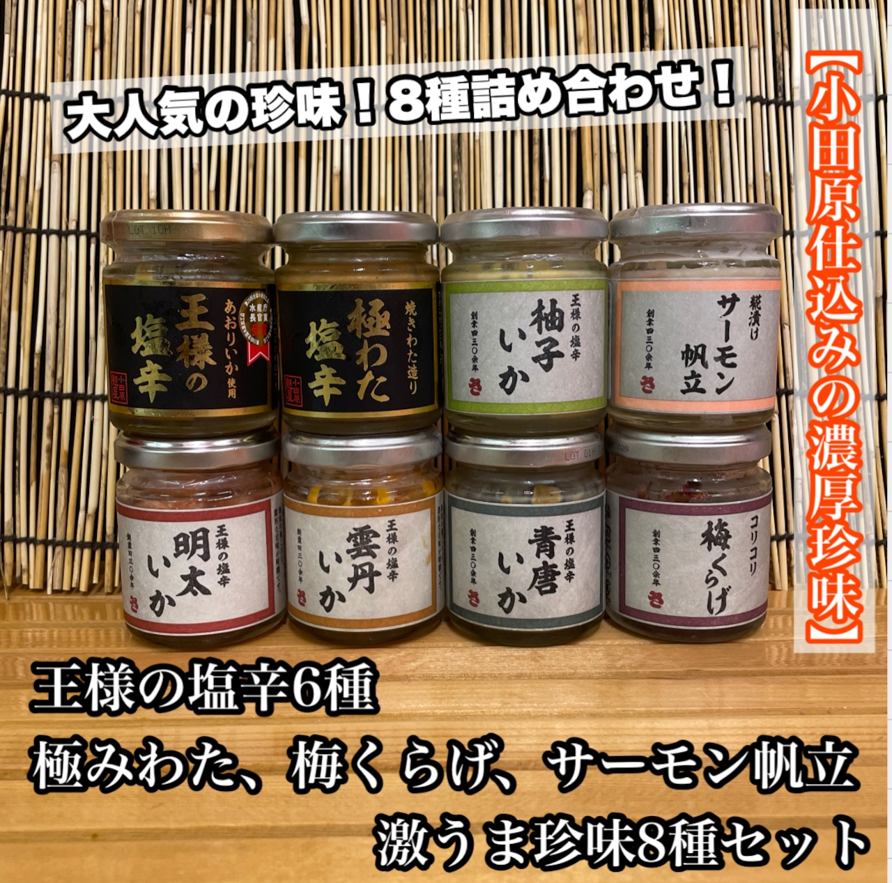 海鮮珍味 8種 各1本【王様の塩辛:焼きわた 明太子 ゆず 雲丹 青唐】【極みわたの塩辛】【梅くらげ】【サーモン帆立】