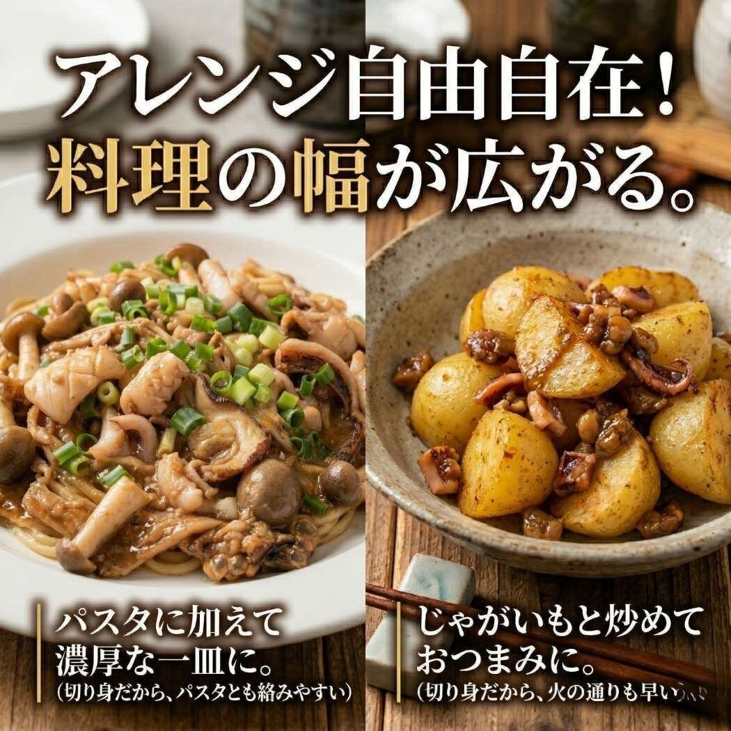 フライパンでバター焼きにすれば、イカゴロの旨みが引き立つ一品になります。パスタに加えると、簡単なのにコクのある味わいになり、じゃがいもと炒めればおつまみにもおかずにもぴったりです。いろいろな料理に使いやすく、ひとつあると便利な商品です。