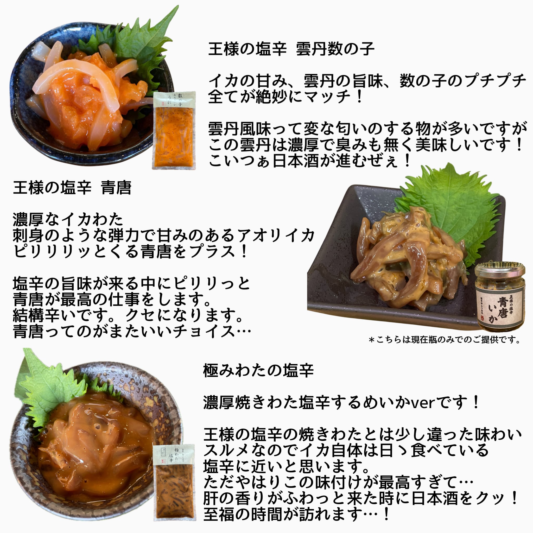 一般的な塩辛はスルメイカ(真イカ)が使われていますが、 王様の塩辛は、アオリイカを使用したこだわりの逸品です。長年にわたり伝統と技術を重ねてきた老舗が作り出したこの塩辛は、その濃厚な旨味が特長です。